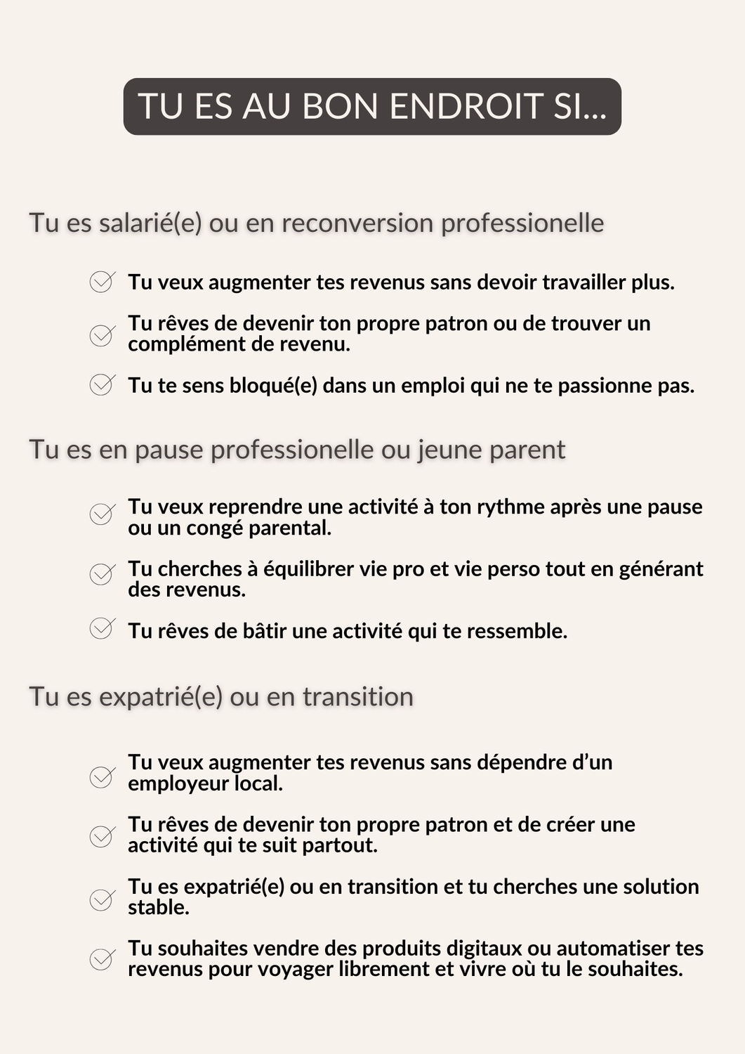 Aujourd’hui, je construis mon activité digitale en parallèle d’une vie bien active. Ce projet m’apporte du sens, de la liberté et une sérénité financière tout en étant expatriée.